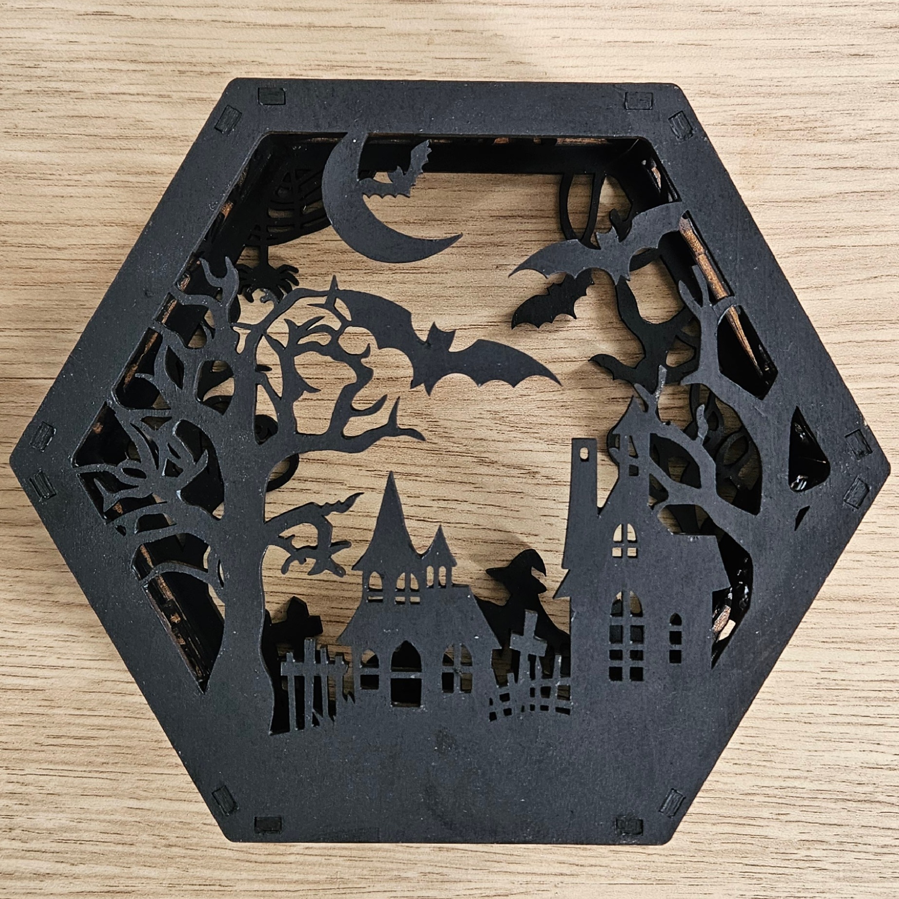 Illuminez vos soirées d’automne avec cette superbe lanterne d’Halloween hexagonale en bois 🎃.