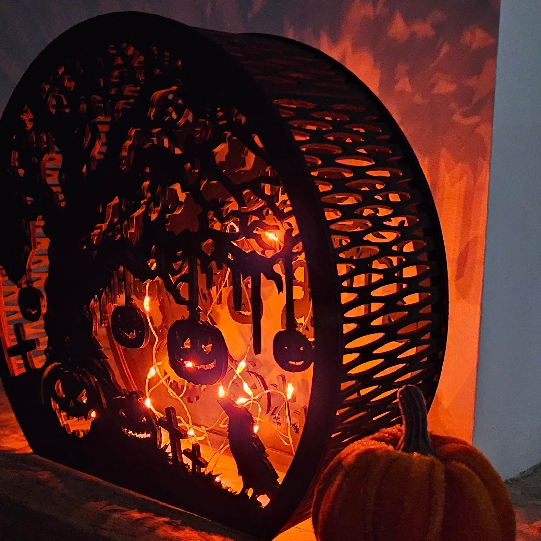 Illuminez vos soirées d’automne avec cette superbe lanterne d’Halloween ronde en bois 🎃.