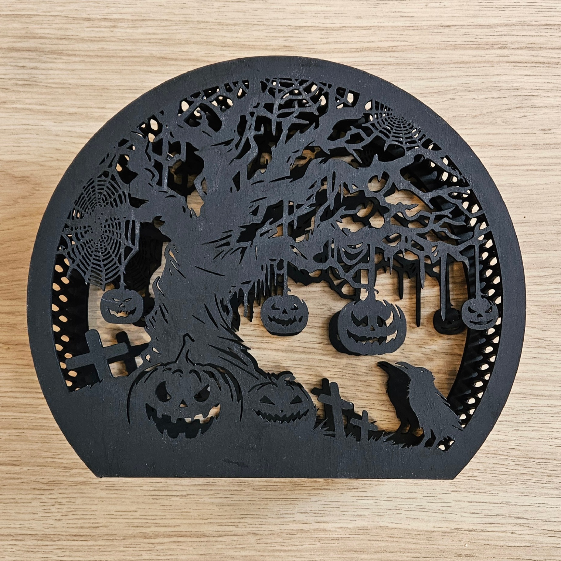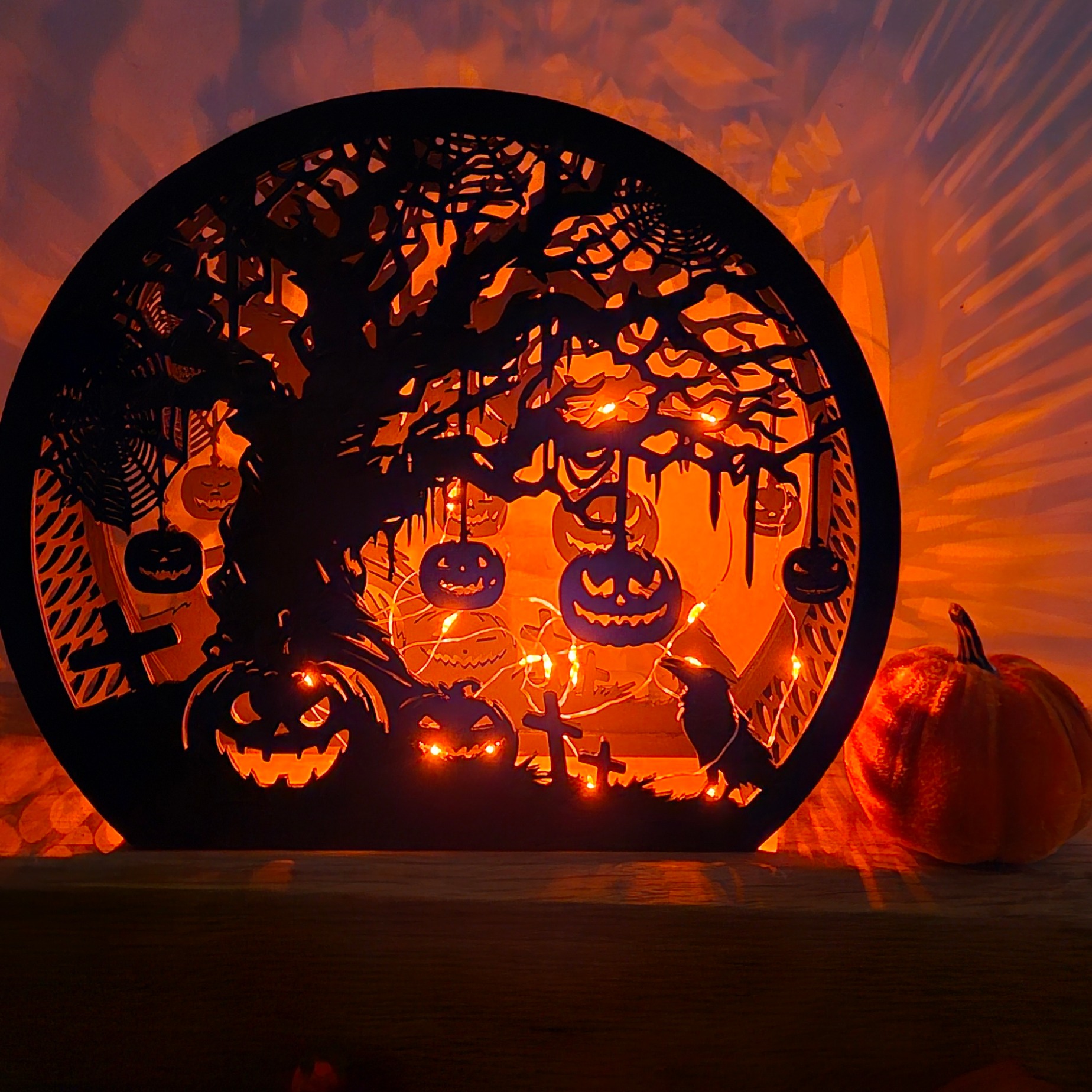 Lanterne Halloween ronde en bois – déco lumineuse citrouille arbre et corbeau – photophore artisanal pour ambiance d’automne