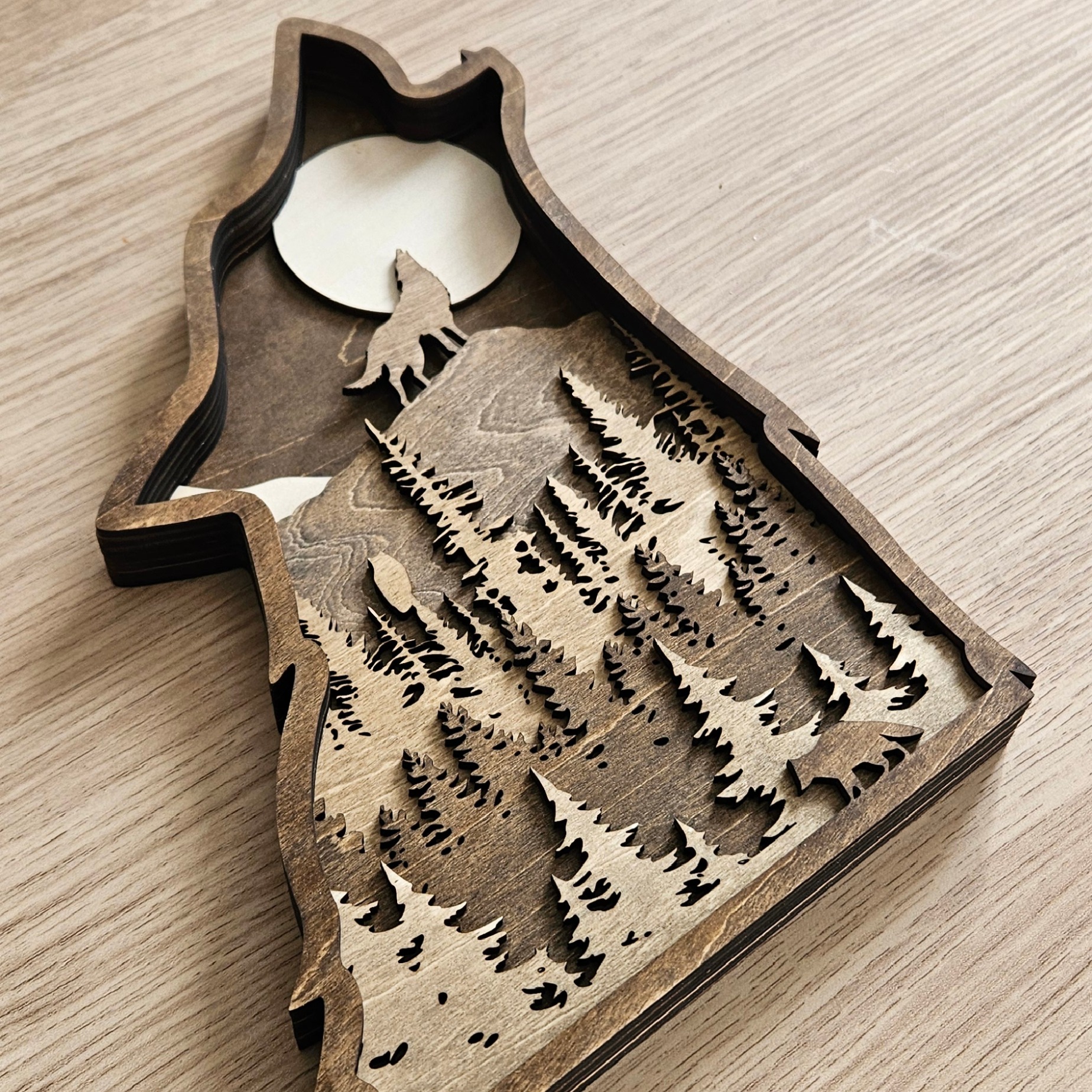 Loup 3D décoratif en bois teinté – Sculpture murale en bois – Art mural nature