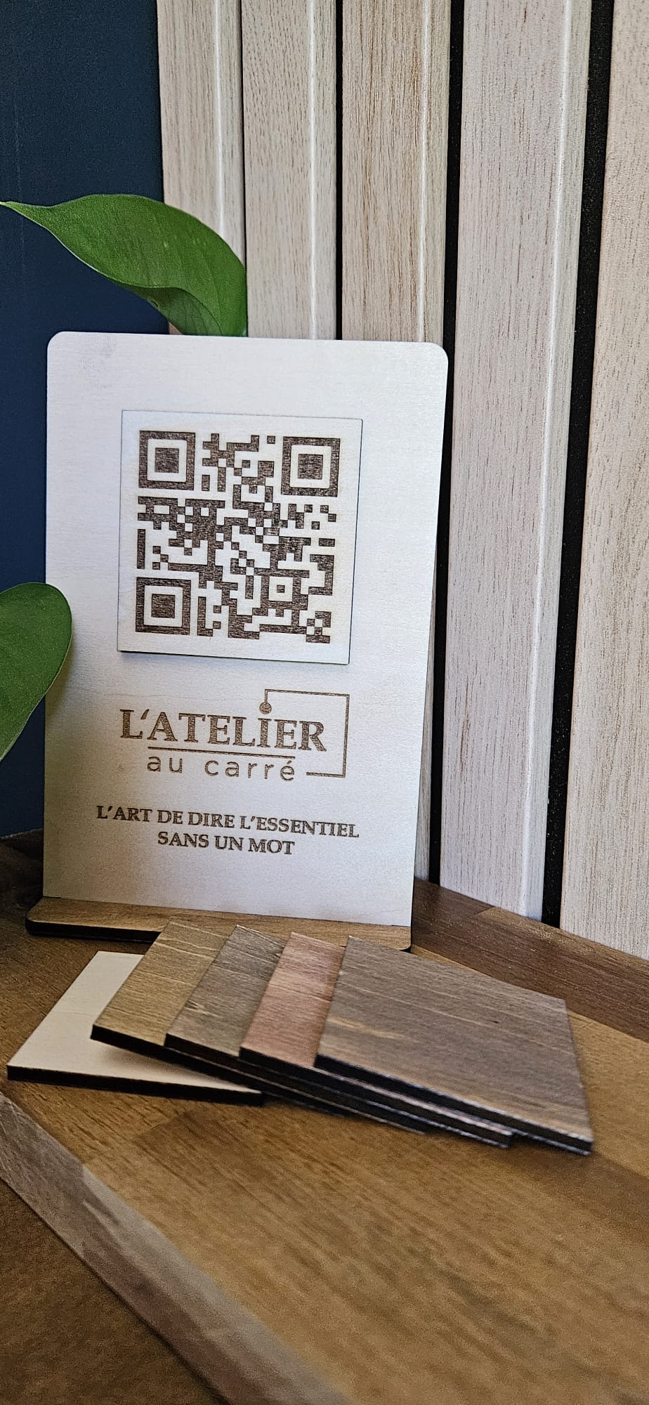 Cette pancarte en bois personnalisée avec QR code vous permettra de mettre en avant votre société sur vos évènements type salon, marché etc. et peut vous permettre également grâce au QR code intégré de renvoyer vos clients vers votre site web, votre documentation ou encore vos menus et liens de paiement si vous êtes dans la restauration.
